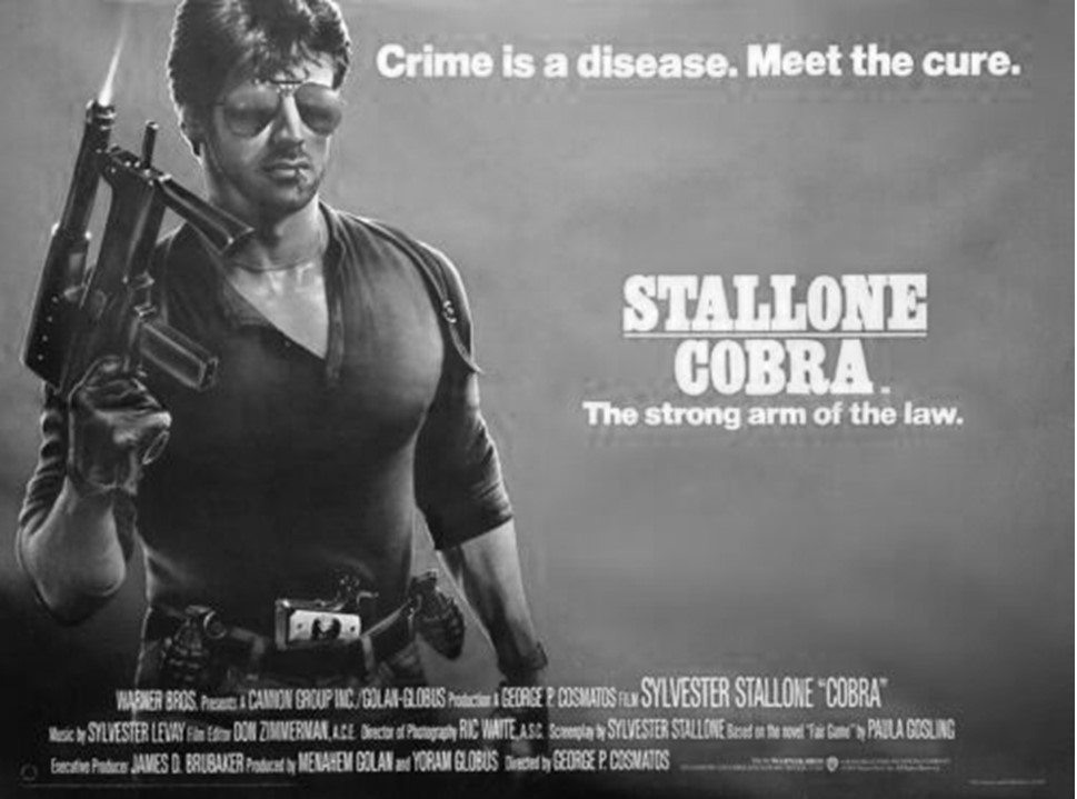 El tagline de «Cobra» es poderoso en lo diciente: «El crimen es una enfermedad. Él es la cura. El brazo más fuerte de la ley». Al yuxtaponerlo con una de las citas más recitadas de la película: «aquí es donde la ley muere, y yo surjo», es imposible no ver en los diálogos los apartes de un discurso fascista, explayando a lo largo del filme un detestable ideario que es exhibido con orgulloso. Una de las escenas más representativas es aquella cuando, después de asesinar a un criminal robando un supermercado, el personaje de Silvester Stallone deja claro que, para él, ese ciudadano no tiene derechos. En conversación con la líder femenina de la historia, interpretada por Brigitte Nielsen (algo de machismo también se siente pues la mujer linda es la víctima, la menos atractiva la asesina), se diagnóstica el problema de inseguridad ciudadana como uno causado por jueces que dejan en libertad a los criminales, previamente por la policía atrapados. Presos sin derecho a juicio es el ideal.